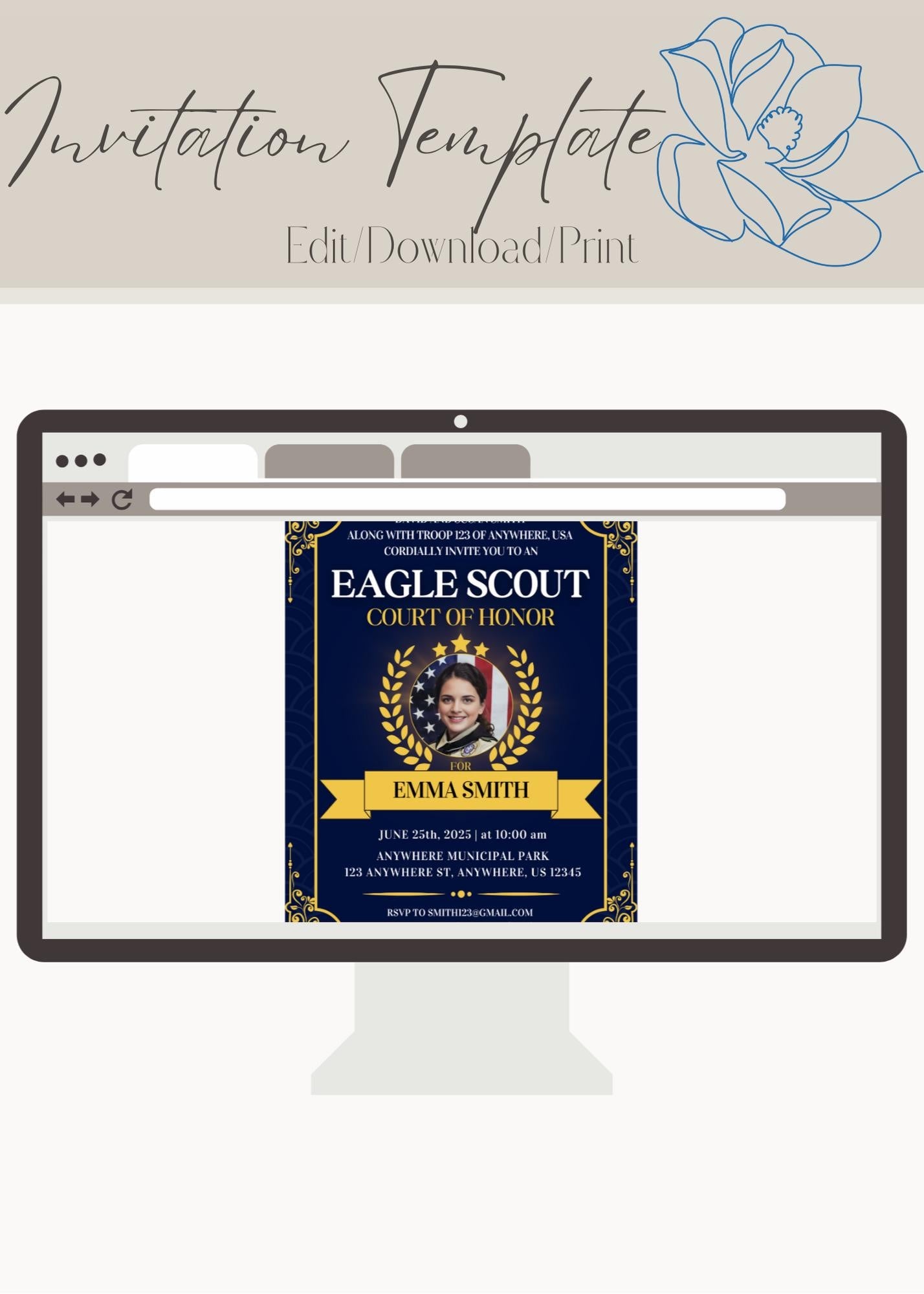 Celebrate the remarkable achievement of your Eagle Scout with our elegant, customizable Eagle Scout Court of Honor Invitation. Designed for ease and style, this invitation is editable in Canva, allowing you to personalize the details to perfection. Once customized, you can print the invitation yourself or send to the printer of your choice. You can also effortlessly share the invitation digitally via text, ensuring that family and friends can join in the celebration from anywhere. Make this momentous occasion unforgettable with our beautifully crafted invitation!